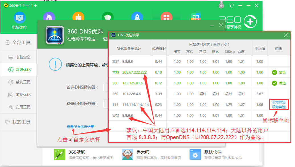 如您不放心,请使用方案②方案② – 使用「360DNS优选」,打开360卫士,根据以下图示操作: